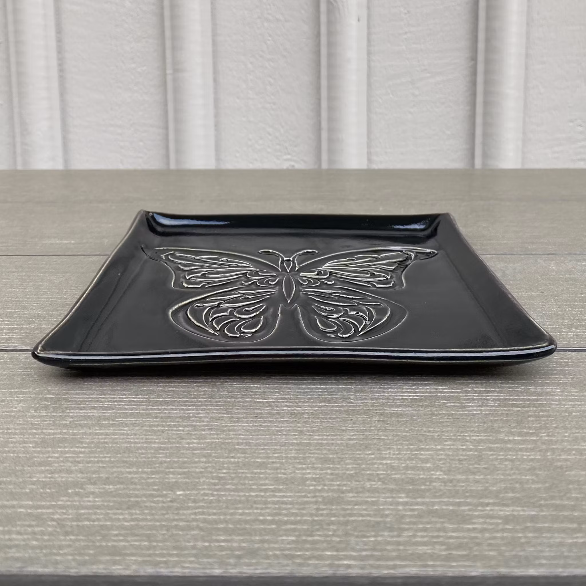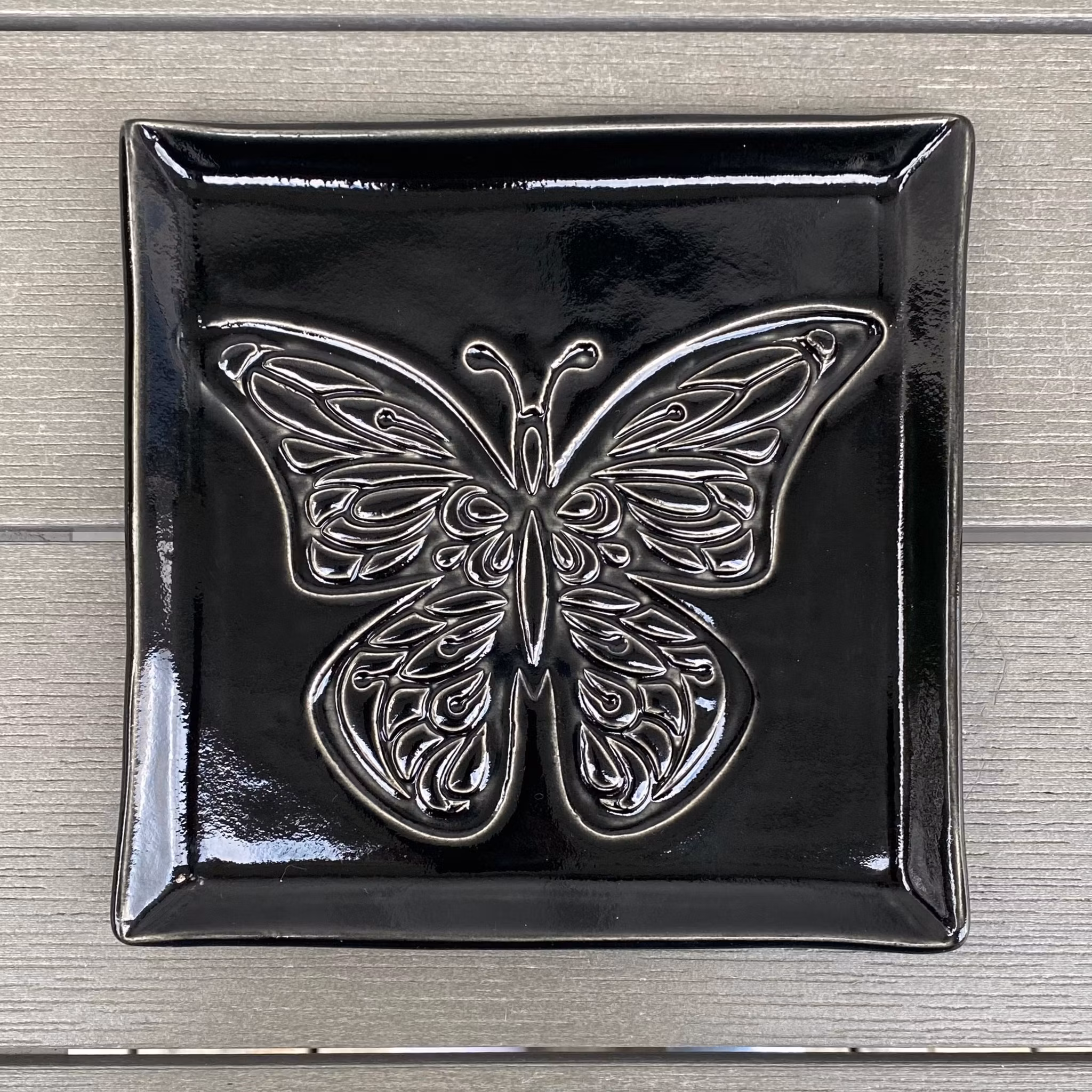 Ett handgjort fyrkantigt fat med svart blank glasyr på vit lera som skapar ett vackert fjärilsmönster. Tillverkad i stengodslera och tål därför ugn, mikrovågsugn och diskmaskin.