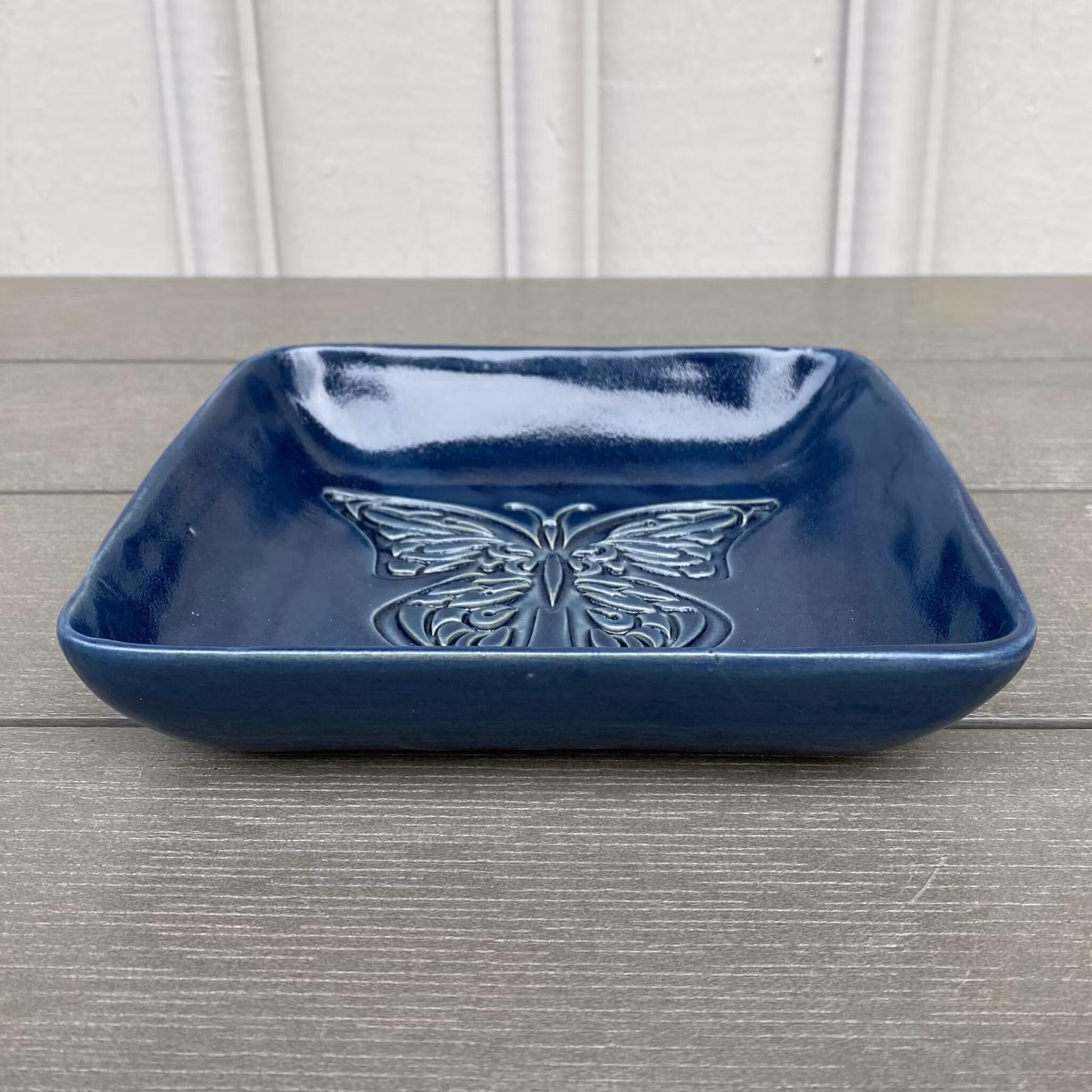 Ett fantastiskt vackert uppläggningsfat i en underbar blå nyans, prytt med en fin fjäril i botten. Tillverkat i tålig stengodskeramik och perfekt att använda i mikron, ugnen eller till och med på grillen. En både praktisk och dekorativ favorit i köket!