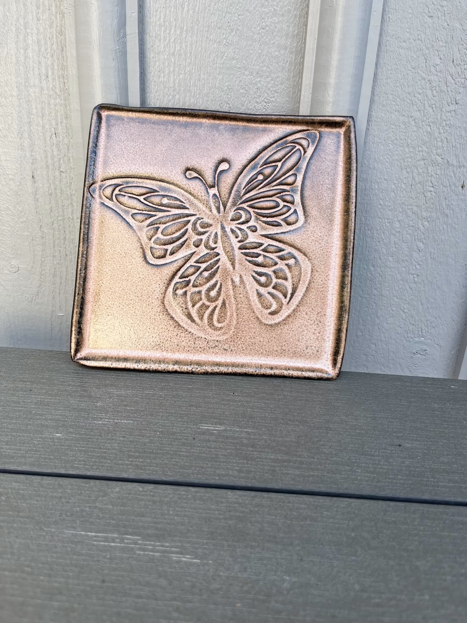 Ett handgjort fyrkantigt fat med rosa glasyr på svart lera som skapar ett vackert fjärilsmönster. Tillverkad i stengodslera och tål därför ugn, mikrovågsugn och diskmaskin.