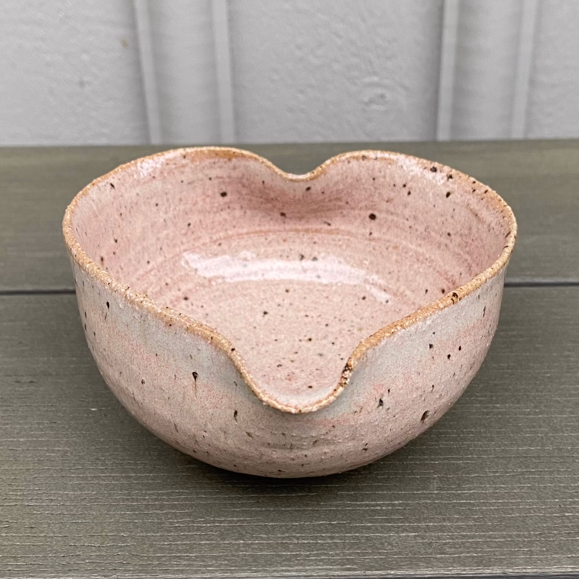 Denna vackra rosa nyans har skapats i en lava-fleckad lera, vilket ger varje exemplar ett helt unikt uttryck. Det naturliga mönstret i leran tillsammans med den varma färgen skapar en levande och personlig känsla, som gör varje skål till något alldeles eget.