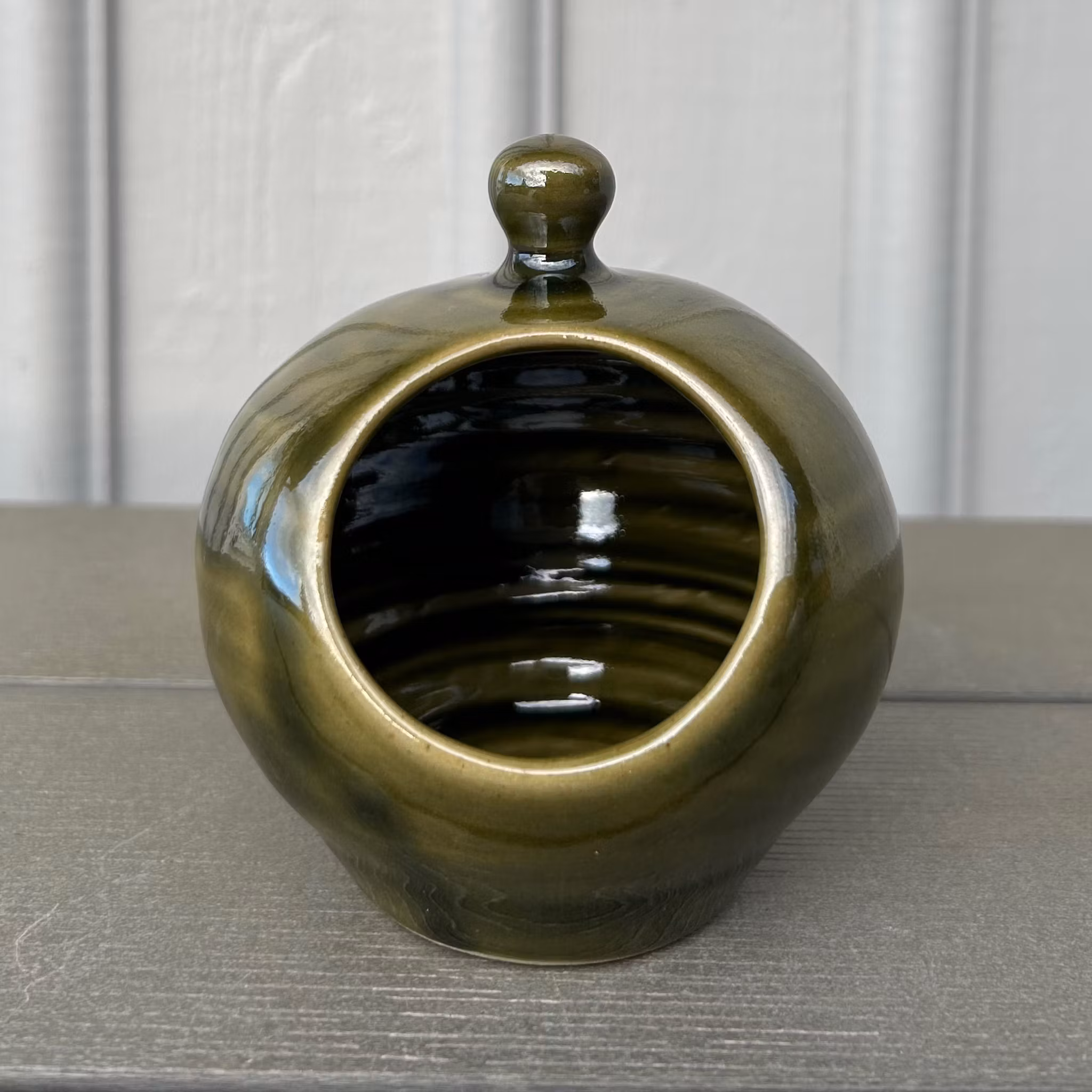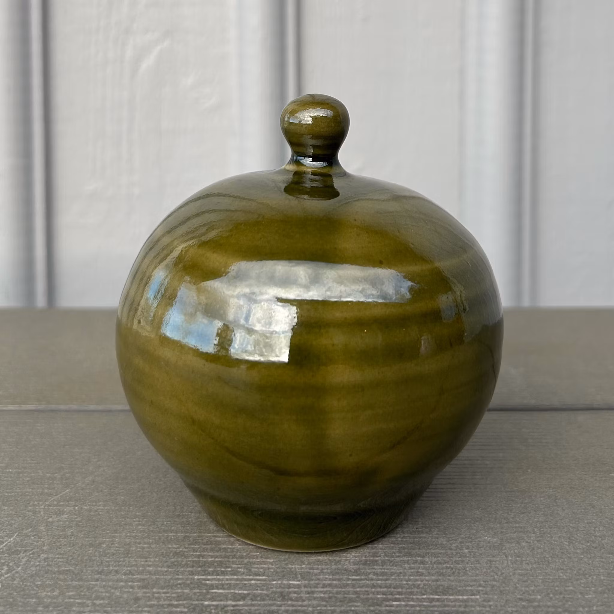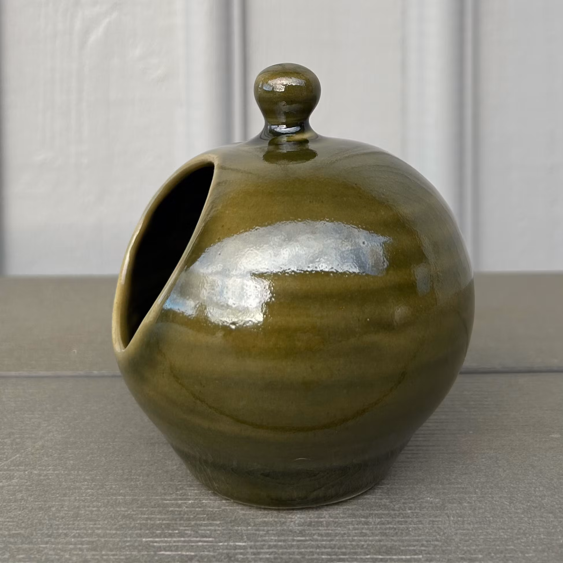 Duka vackert med denna handgjorda saltgömma i pinjegrön keramik, perfekt för att servera flingsalt eller små kryddor vid bordet. Varje skål är unik och bär spår av det kärleksfulla hantverket bakom.