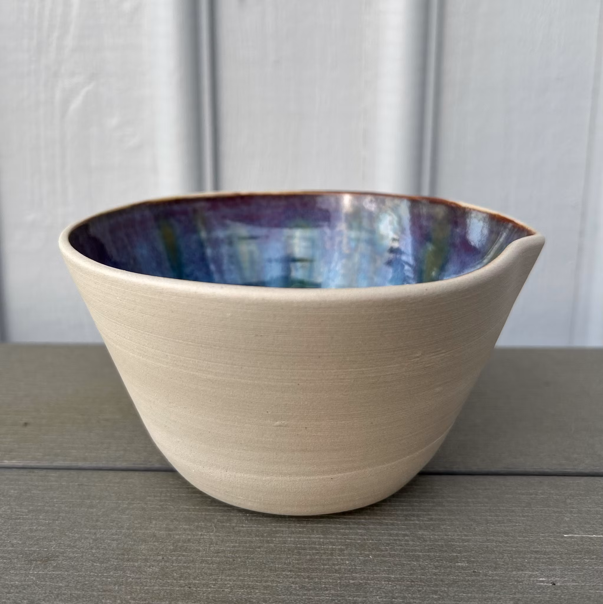 Skål med snip, unik och färgstark Den handgjorda skålen med snip är både praktisk och dekorativ, med en form som gör den perfekt för servering av såser, dressingar eller mindre tillbehör. Utsidan är oglaserad och har en rustik, naturlig känsla som kontrasterar vackert mot den färgstarka insidan.